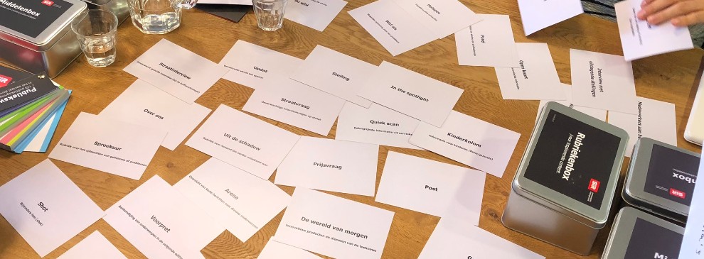 Benieuwd hoe je het beste aan het werk kunt met de Rubriekenbox? Of hoe je de Rubriekenbox het beste kunt inzetten voor jouw case/onderwerp? We organiseren graag voor jou (en je collega’s) een workshop ‘Werken met de Rubriekenbox’. Passend bij het onderwerp of de case die je zelf inbrengt.