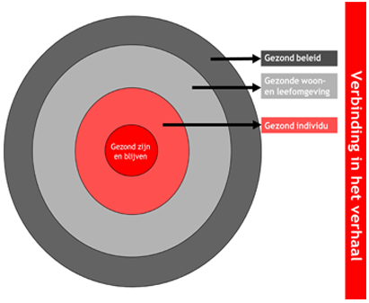 De verbinding in het verhaal vinden we door alles wat GGD Twente doet, te koppelen aan de kern: gezond zijn en blijven. Iedere medewerker/afdeling/team draagt bij aan een gezond individu, een gezonde woon- en leefomgeving en/of gezond beleid. Dit doen zij door preventie (voorkomen dat je ziek wordt) en het bieden van advies/ondersteuning (helpen gezonde keuzes te maken).